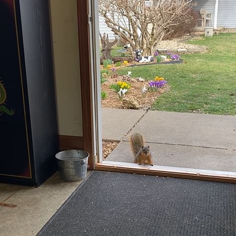A. I have a female red fox squirrel named Tim, who isn’t really a pet, but she comes to visit often. (Pictured below)